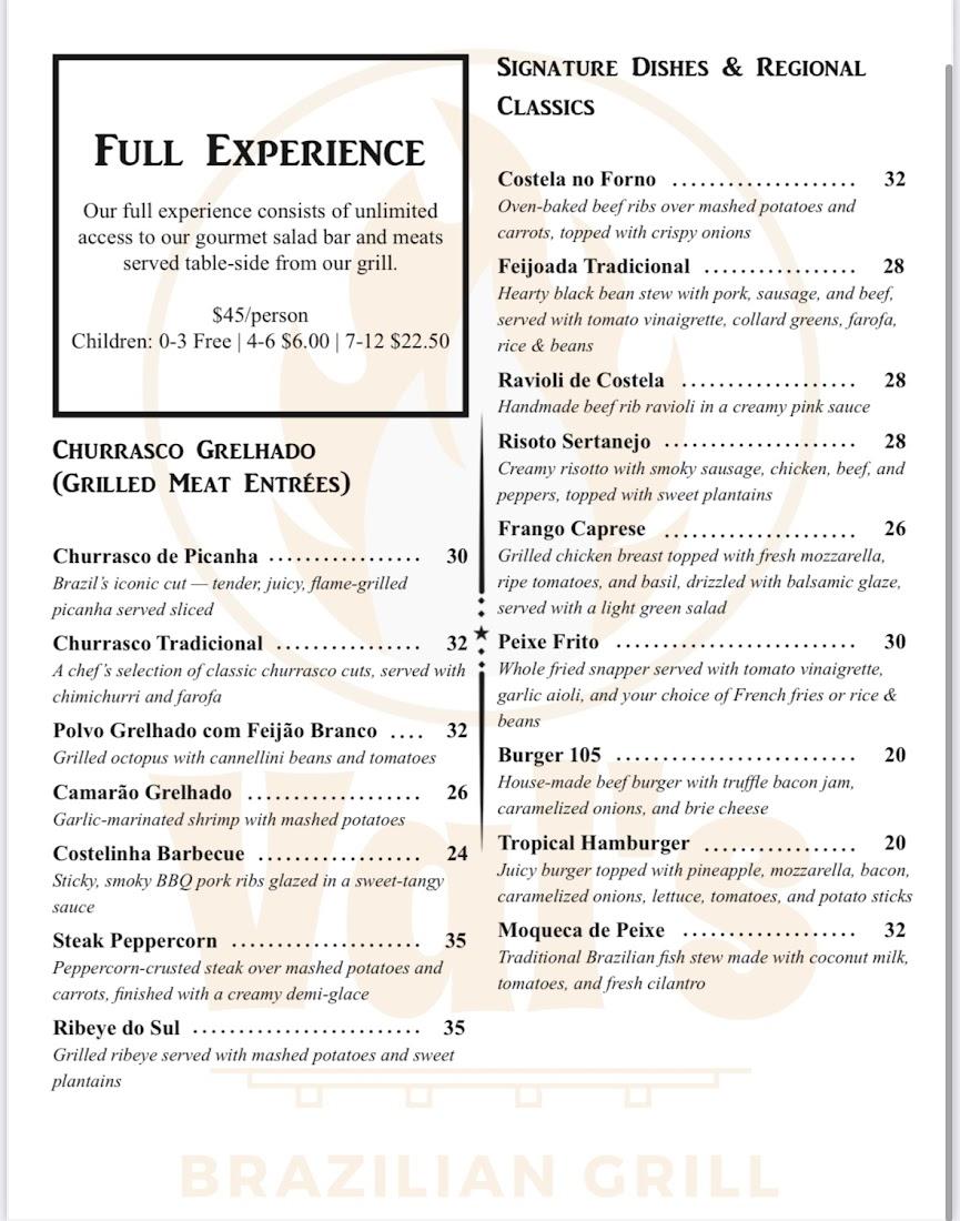 The menu is a celebration of Brazilian tradition combined with local influences, featuring a rodizio-style service where a variety of grilled meats—including the ever-popular picanha—are served table-side, alongside a buffet stocked with fresh salads, sides, and regional favorites.